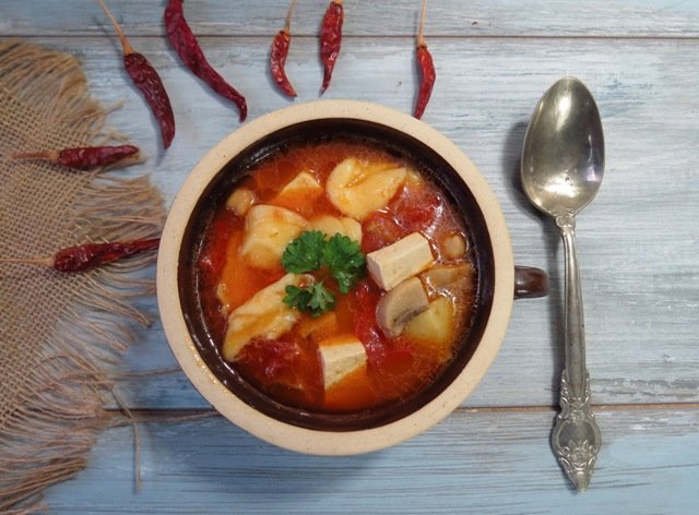 Pokrojoną w kostkę cebulę wrzucamy na rozgrzany olej i kiedy się delikatnie zeszkli dodajemy posiekaną paprykę, papryczkę chilli i wyciśnięty czosnek. Podsmażamy przez chwilę, a następnie dodajemy pomidorową pulpę. Dusimy pod przykryciem na wolnym ogniu przez 10 minut i zalewamy bulionem. Dodajemy ziemniaki, pieczarki, cieciorkę, ziele angielskie, liście laurowe, paprykę słodką i ostrą. Gotujemy na wolnym ogniu pod przykryciem przez ok. godziny. Pod koniec gotowania dodajemy pokrojone w kostkę tofu, Na koniec doprawiamy solą i pieprzem. Na patelni rozgrzewamy masło i dodajemy mąką, podsmażamy i tak przygotowaną zasmażkę dodajemy do zupy. Rozbijamy jajko z wodą i dodajemy mąkę i sól, aby powstała gęsta, ale plastyczne masa. Za pomocą rozgrzanej w zupie łyżki nabieramy trochę kluskowej masy i wkładamy ją do zupy. Czynność tę powtarzamy, aż skończy się całe ciasto. Gotujemy na wolnym ogniu jeszcze ok. 10 min.