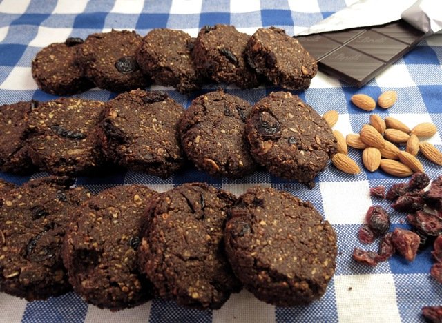 Idąc za radą starożytnych Greków, postanowiliśmy więc poszukać złotego środka. Z jednej strony, potraktowaliśmy sygnały naszych organizmów poważnie, z drugiej, nie rzuciliśmy się na pierwsze lepsze słodycze. Zrobiliśmy sobie bowiem nasze szybkościowe ciasteczka migdałowe w wersji czekoladowej z dodatkiem morwy białej. Nasza diabelska ochota na słodycze dostała zatem swój ogarek, ale na ołtarzu zdrowego stylu życia pojawiło się kakao i czekolada (magnez), migdały (nienasycone kwasy tłuszczowe, magnez, miedź, błonnik), morwa biała (flawonoidy) i żurawina (wapń, fosfor, miedź i jod). A co najważniejsze, po zjedzeniu ciasteczek nasze organizmu dały nam sygnał, że ich oczekiwania zostały należycie odczytane.