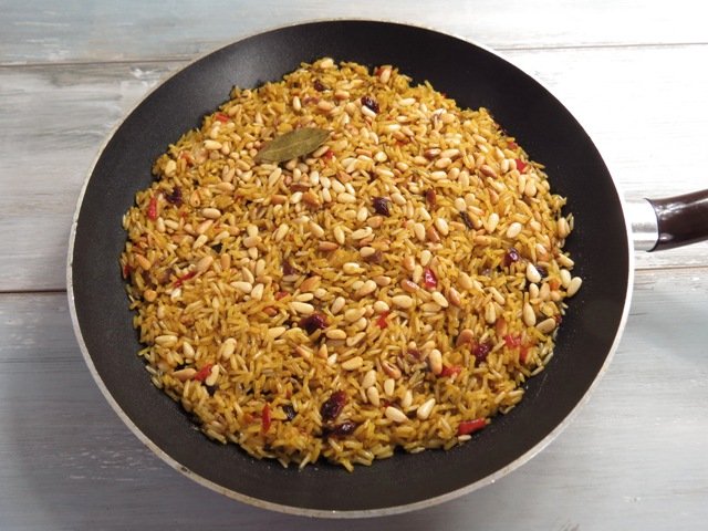 Posiekaną papryczkę podsmażamy wraz z czosnkiem na rozgrzanym oleju. Dodajemy ryż i smażymy aż się delikatnie podpiecze. Zalewamy częścią gorącego bulionu, dodajemy przyprawy i mieszamy. Gotujemy na wolnym ogniu aż ryż będzie miękki, dodając ewentualnie bulion jeśli ryż zaczyna wysychać. Na koniec dodajemy suszone porzeczki, mieszamy o odstawiamy jeszcze na kilka minut w ciepłym miejscu. Przed podaniem mieszamy w przyprażonymi orzeszkami pinii.