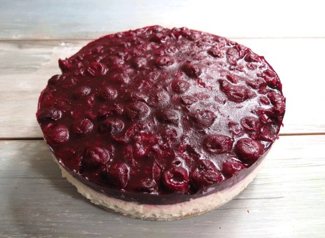 Wiśnie łączymy z syropem i doprowadzamy do wrzenia w rondlu o grubym dnie. Jeśli korzystamy w z wiśni mrożonych, trzeba je najpierw rozmrozić. Doprawiamy wiśnie cynamonem, kardamonem i ewentualnie cukrem do smaku (najlepiej, żeby były trochę cierpkie) i odstawiamy na je kilkanaście minut. Dodajemy 3 łyżeczki agaru i ponownie doprowadzamy do wrzenia. Zdejmujemy z ognia i kiedy wiśnie zaczną tężeć wykładamy je równomiernie na wierzch masy serowej. Ponownie wstawiamy do lodówki, aż całość dobrze stężeje.