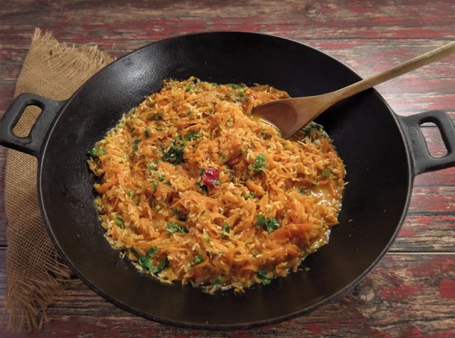 Kokos i wyciśnięty czosnek ucieramy z 1 łyżeczką gorczycy na jednolita masę. Marchew startą na wiórki gotujemy wraz z posiekanymi papryczkami chilli z odrobiną wody i soli, aż zacznie mięknąć. Do marchwi dodajemy mleko kokosowe, mieszamy i dusimy jeszcze przez kilka minut. Na rozgrzany olej kokosowy wrzucamy pastę z kokosa, kozieradkę, pozostałą cześć gorczycy i pokruszone liście curry. Mieszamy i całość dodajemy do marchewki wraz z olejem. Potrawę dokładnie mieszamy, dodajemy suszone czerwone curry w dużych kawałkach, doprawiamy do smaku solą, pieprzem i ewentualnie cukrem. Podajemy z jako dodatek do innych dań lub jako danie główne z ryżem lub pęczakiem.