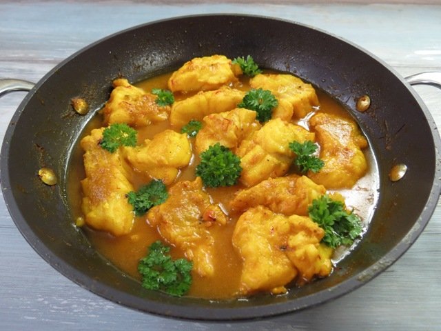 Cebulę trzemy na tarce o grubych oczkach i wrzucamy na rozgrzane masło wraz z drobno posiekaną papryczką chili. Podsmażamy przez chwilę, aż cebula się zeszkli, a następnie dodajemy cukier i przyprawy. Mieszamy, dodajemy ok. ½ szklanki wody i gotujemy na wolnym ogniu pod przykryciem przez ok. 15 minut, często mieszając. Wystudzamy i miksujemy sos. Następnie ponownie go podgrzewamy na dużej patelni i doprawiamy jeszcze odrobiną szafranu oraz solą i pieprzem do smaku. Kiedy sos zacznie mocno bulgotać wkładamy do niego delikatnie kawałki ryby i przykrywamy patelnię pokrywką. Dusimy filety w sosie ok. 10-15 minut. Przed podaniem przystrajamy natką pietruszki.