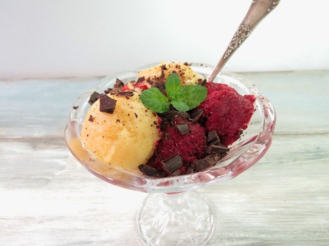 Sorbety jemy raczej rzadko (może to ma jakiś związek z naszym klimatem?), ale kiedy słońce przypieka chętnie zaszywamy się gdzieś w cieniu z obowiązkowym pucharkiem zmrożonych owoców w dłoniach. Ostatnio, coraz częściej eksperymentujemy z sorbetami bez cukru i rezultaty są całkiem obiecujące. Wystarczy cukier zastąpić kawałkiem dojrzałego banana i dosłodzić miodem, aby wystarczająco złamać cierpkość niektórych owoców. Przez chwilę baliśmy się, że smak nam się jakoś dziwnie znarowił i taki bezcukrowy sorbet nie będzie, poza nami, nikomu smakował, ale nasi przesympatyczni znajomi, którzy odwiedzili nas wczoraj potwierdzili, że taki sorbet jeść się da i to nawet bardzo. Zjedliśmy go więc do końca – na wypadek gdyby ochłodziło się już jutro.
