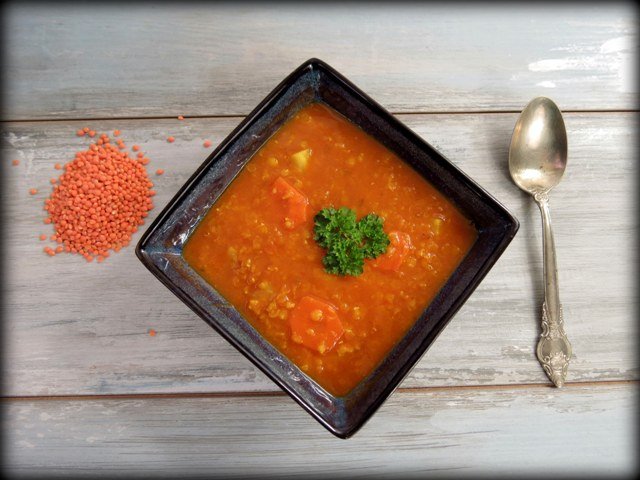 Warzywa, myjemy oczyszczamy, kroimy w kostkę i dusimy wraz z posiekanym czosnkiem i imbirem na maśle klarowanym. Zalewamy gorącym bulionem i dodajemy przecier pomidorowy. Dodajemy ziemniaki i doprawiamy przyprawami. Gotujemy na wolnym ogniu przez ok. 10 minut. Dodajemy soczewicę i gotujemy jeszcze przez ok. 10 minut, aż warzywa i soczewica będzie miękka. Przed podaniem doprawiamy solą i czarnym pieprzem do smaku.