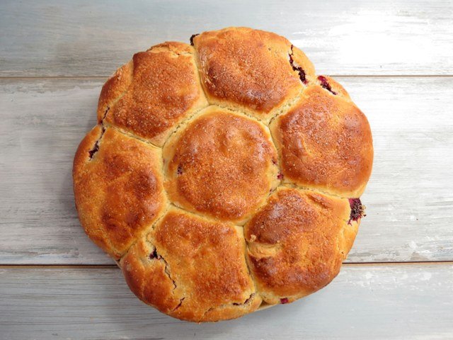 Po wyrośnięciu, na oprószonej mąką tortownicy, ciasto dzielimy na 7-8 części. Z każdej z nich formujemy placuszek, który faszerujemy wiśniami wymieszanymi z dwoma łyżkami cukru oraz kardamonem i cynamonem i formujemy małą bułeczkę. Przygotowane w ten sposób bułeczki układamy w miarę blisko na posmarowanej masłem i oprószonej mąką tortownicy. Bułeczki nie powinny się stykać, bo i tak rosnące ciasto połączy je w jeden w placek. Bułeczki smarujemy rozbitym widelcem białkiem jajka i posypujemy grubym cukrem. Następnie pieczemy je piekarniku rozgrzanym do 170 stopni przez ok. 30 minut, aż ciasto ładnie się zarumieni. Wyjmujemy z piekarnika i przestudzamy.