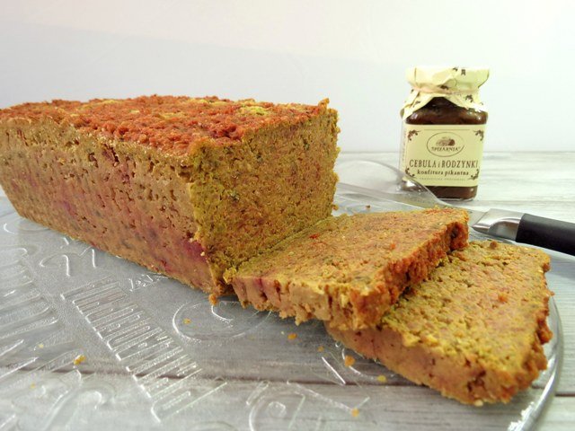 Na rozgrzane na patelni masło wrzucamy posiekany czosnek i papryczkę i przez chwilę podsmażamy. Następnie dodajemy kolendrę, kozieradkę, gorczycę, curry oraz kurkumę, a następnie dokładnie mieszamy i podsmażamy aż przyprawy zaczną pięknie pachnieć. Dodajemy umyte, obrane i starte na grubej tarce buraki i dusimy przez ok. 20 minut, dodając od czasu do czasu odrobinę gorącej wody, jeśli buraki są zbyt suche. Mielimy uduszone buraki wraz z komosą ryżową, soczewicą, cieciorką i doprawiamy do smaku solą i pieprzem. Dodajemy roztrzepane jajka, mieloną konopię i dokładnie mieszamy. Tak przygotowaną masę wykładamy do rynienki wysmarowanej masłem i oprószonej siemieniem lnianym. Wkładamy do piekarnika rozgrzanego do 170 stopni i pieczemy przez ok. 30 minut aż pasztet się wyzłoci. Przed podaniem dokładnie wystudzamy – najlepiej przez noc w lodówce. Można podawać z żurawiną, chrzanem lub ćwikłą – my jedliśmy go z naszą spiżarnianą konfiturą z cebuli.