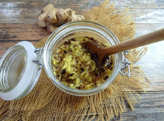 Kiedy zaczyna się pora mrozów, stosujemy naszą domową miksturę, która łatwa jest w przygotowaniu, doskonale rozgrzewa i dodatkowo znakomicie smakuje. Otóż do słoika wrzucamy obrany i starty na drobnej tarce korzeń świeżego imbiru, przesypujemy to kawałkami surowego kakao a całość zalewamy miodem lipowym prosto z pasieki. Odstawiamy takie cudo na noc do lodówki i mikstura gotowa. Przez noc imbir puści trochę soku, który zmiesza się z miodem. Miód z kolei złagodzi nieco imbirową ostrość. Imbir doskonale rozgrzewa jest idealny na przeziębienia i stany zapalne stawów, i dodatkowo poprawia trawienie. Miód lipowy z kolei działa antyseptycznie, uspokajająco i od wieków stosowany przy chorobach gorączkowych, kaszlu oraz zapaleniu oskrzeli. A dlaczego dodajemy do tego kawałki surowego kakaowca? No cóż, moglibyśmy napisać, że są znakomitym źródłem przeciwutleniaczy i magnezu, ale tak po prawdzie, to dodajemy je wyłącznie z łakomstwa, bo nie dosyć, że nadają naszej miksturze pysznej goryczki, to jeszcze rozkosznie chrupią w zębach.