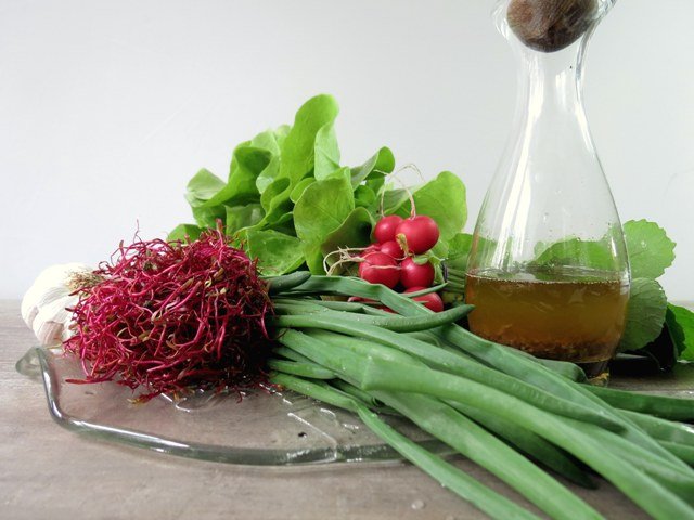 Nadszedł wreszcie długo oczekiwany moment. W naszym ulubionym gospodarstwie rolnym wreszcie swoje podwoje otworzył warzywny sklepik. Na razie oferta nie jest może szczególnie imponująca, ale produkty jak najbardziej „pierwszego sortu”, prosto z pola (no może jeszcze z foliowego tunelu) i niepryskane. Do kupienia była chrupiąca i pachnąca słodyczą sałata masłowa, młoda rzodkiewka i jędrna dymka. Kupiliśmy więc wszystko jak leci. W końcu nowalijki, więc można zaszaleć. Kiedy już opłukaliśmy nasze nowalijki z piachu, dodaliśmy do nich kiełków buraka i zrobiliśmy z nich sobie sałatę z dressingiem orzechowym.