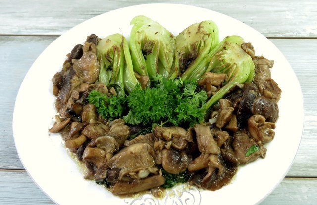 Pok choi myjemy, osuszamy, przekrajamy wzdłuż i podsmażamy delikatnie z obu stron na rozgrzanym na patelni maśle klarowanym. Na sam koniec dodajemy do warzywa wyciśnięty ząbek czosnku. Umyte grzyby kroimy i podsmażamy na maśle klarowanym z dodatkiem wyciśniętego czosnku, a następnie dodajemy sos sojowy i dusimy przez ok. 10 minut na wolnym ogniu, żeby grzyby zmiękły. Dodajemy grzyby do podsmażonego pok choi i dusimy przez kilka minut, aż kapusta będzie miękka. Przed podaniem przyprawiamy pieprzem, ale raczej nie solimy, bo sos sojowy jest wystarczająco słony. Na talerzu można danie przybrać natką pietruszki.