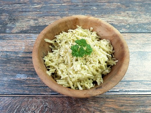 Rzepę myjemy dokładnie i obieramy, a następnie trzemy na tarce o grubych oczkach. Solimy do smaku i mieszamy z olejem. Ostawiamy na 10 minut. Posypujemy ziarenkami konopi i przybieramy natką.