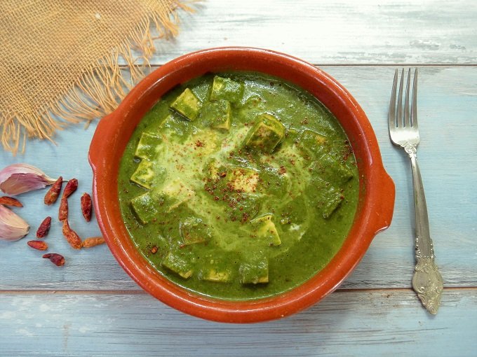 Na rozgrzane na patelni 2-3 łyżki oleju wrzucamy pokrojone w kostkę tofu. Dodajemy 2 łyżeczki garam masala, 2 łyżeczki kminu rzymskiego, odrobinę pieprzu kajeńskiego oraz 2 wyciśnięte ząbki czosnku. Mieszamy i smażymy przez ok 10 min na wolnym ogniu. Szpinak miksujemy z orzechami nerkowca, 1 szklanką mleka migdałowego lub kokosowego, posiekaną papryczką chili, imbirem, 2 łyżeczkami garam masala, cukrem lub syropem z agawy, dwoma wyciśniętymi ząbkami czosnku oraz posiekanym pomidorem bez skóry. Jeżeli zmiksowana w ten sposób masa jest zbyt gęsta, dodajemy trochę więcej mleka, jeżeli zbyt rzadka – więcej orzechów nerkowca. Tak przygotowany zielony, szpinakowy sos wlewamy do smażącego się tofu i dokładnie mieszamy. Solimy do smaku. Dusimy jeszcze przez chwilę, żeby składniki się połączyły. Przed podaniem dodajemy łyżkę gęstej śmietanki z mleka migdałowego lub kokosowego, delikatnie mieszamy i posypujemy odrobiną garam masala. Podajemy z ryżem lub chlebkami naan. Nasz przepis na chlebek naan znajdziecie tu - chlebek naan