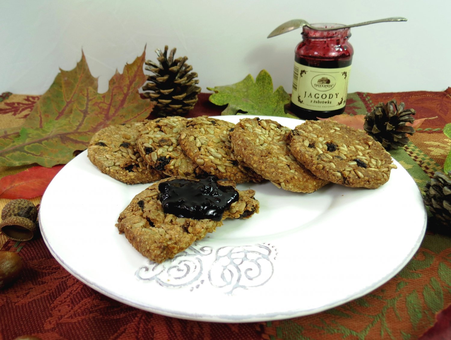 Dla uczczenia tego pięknego jesiennego dnia po powrocie do domu szybko zrobiliśmy ciasteczka ryżowe, które schrupaliśmy z naszą tegoroczną konfiturą jagodową. Ciasteczka były z sezamem i nasionami słonecznika, a konfitura w ostatniej fazie przygotowywania została dosmaczona odrobiną żubrówki.