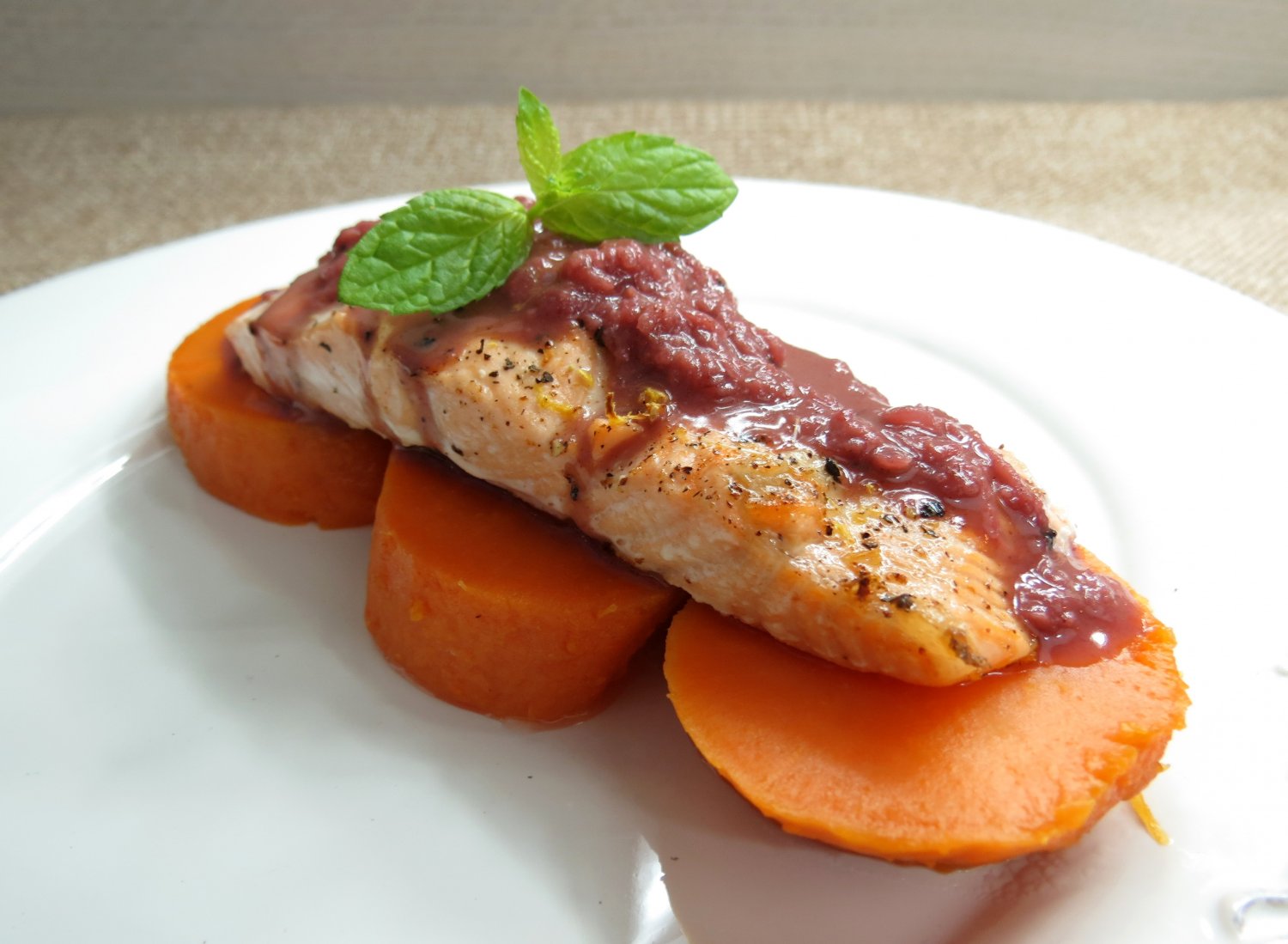 Lubimy czasem połączenia nieoczywiste. Nie tylko w gotowaniu, ale to już inna sprawa. W gotowaniu natomiast dobrze niekiedy pozwolić sobie na pewną swobodę, wyzwolenie się z jarzma przyzwyczajeń smakowych. Cóż z tego, że kubki smakowe wolą z reguły żeglować po znanych wodach, gdzie każdy wir i rafa zostały dobrze opisane, a żaden statek już od wieków nie osiadł na mieliźnie. Kto raz widział przestwór otwartego oceanu lubi jednak niekiedy wyzwolić się spod władztwa utartych szlaków i z pomocą kompasu oraz gwiazd pożeglować w nieznane. Może nie mieliśmy dzisiaj czasu na odkrywanie nowych kulinarnych kontynentów, ale zabawiliśmy się łączeniem pieczonego łososia z wiśniowym sosem.