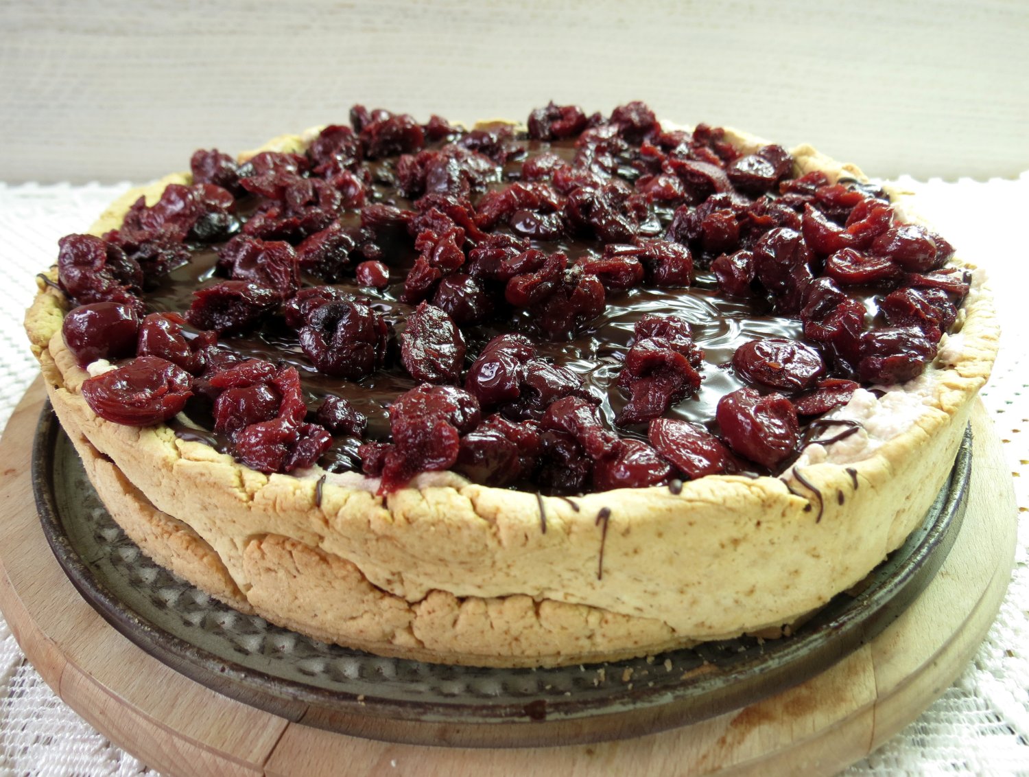 Zupełnie niespodziewanie (w końcu środek stycznia) na głowę zaczęły nam padać dziś płatki śniegu. Owszem, nieśmiało, ale nie można było ich pomylić z lecącymi z nieba piórami aniołów ani unoszonymi wiatrem nasionami dmuchawców. Były mokre i zimne. Śnieg w całej swojej krasie. A myśleliśmy, że zimę mamy już za sobą i udało nam się jakimś dziwnym zbiegiem okoliczności prześlizgnąć się przez niezbyt przez nas lubianą porę roku – zimę w mieście. Nic z tego. W tej sytuacji desperacko postanowiliśmy zjeść coś słodkiego i tłustego, żeby przygotować się na najgorsze. Tarta z kremem kawowym, czekoladą i wiśniami wydała się całkiem niezłym pomysłem.