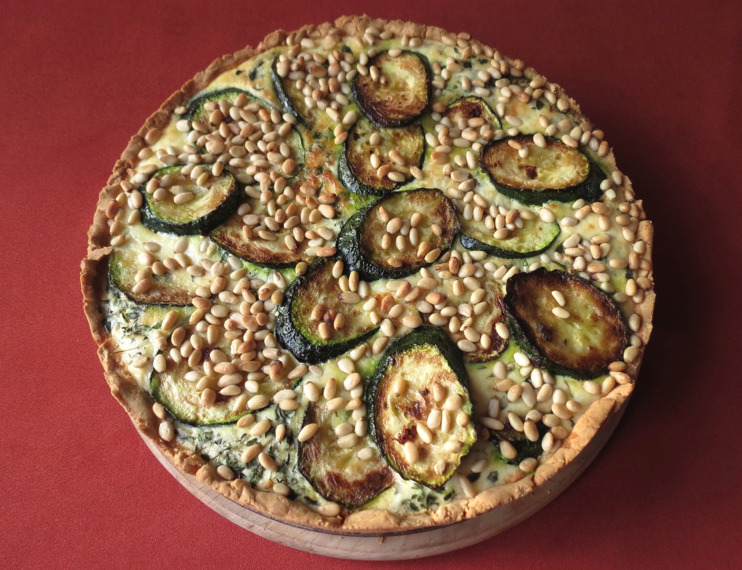 Pociętą w plastry cukinię podsmażamy na złoty kolor na oliwie z odrobiną wyciśniętego czosnku, a następnie wykładamy na serwetkę i osuszamy z nadmiaru tłuszczu. Bryndzę, pozostałe jajka oraz śmietanę miksujemy na jednolita masę i doprawiamy odrobiną pieprzu. Następnie wykładamy całość na podpieczony spód tarty. Posypujemy tymiankiem i rozkładamy na wierzchu równomiernie podsmażone plastry cukinii. Posypujemy pieprzem i wkładamy do piekarnika rozgrzanego do temperatury 170 stopni na 15 minut. Wyjmujemy tartę z piekarnika i posypujemy orzechami pinii. Wkładamy ponownie do piekarnika na kolejne 15 minut.