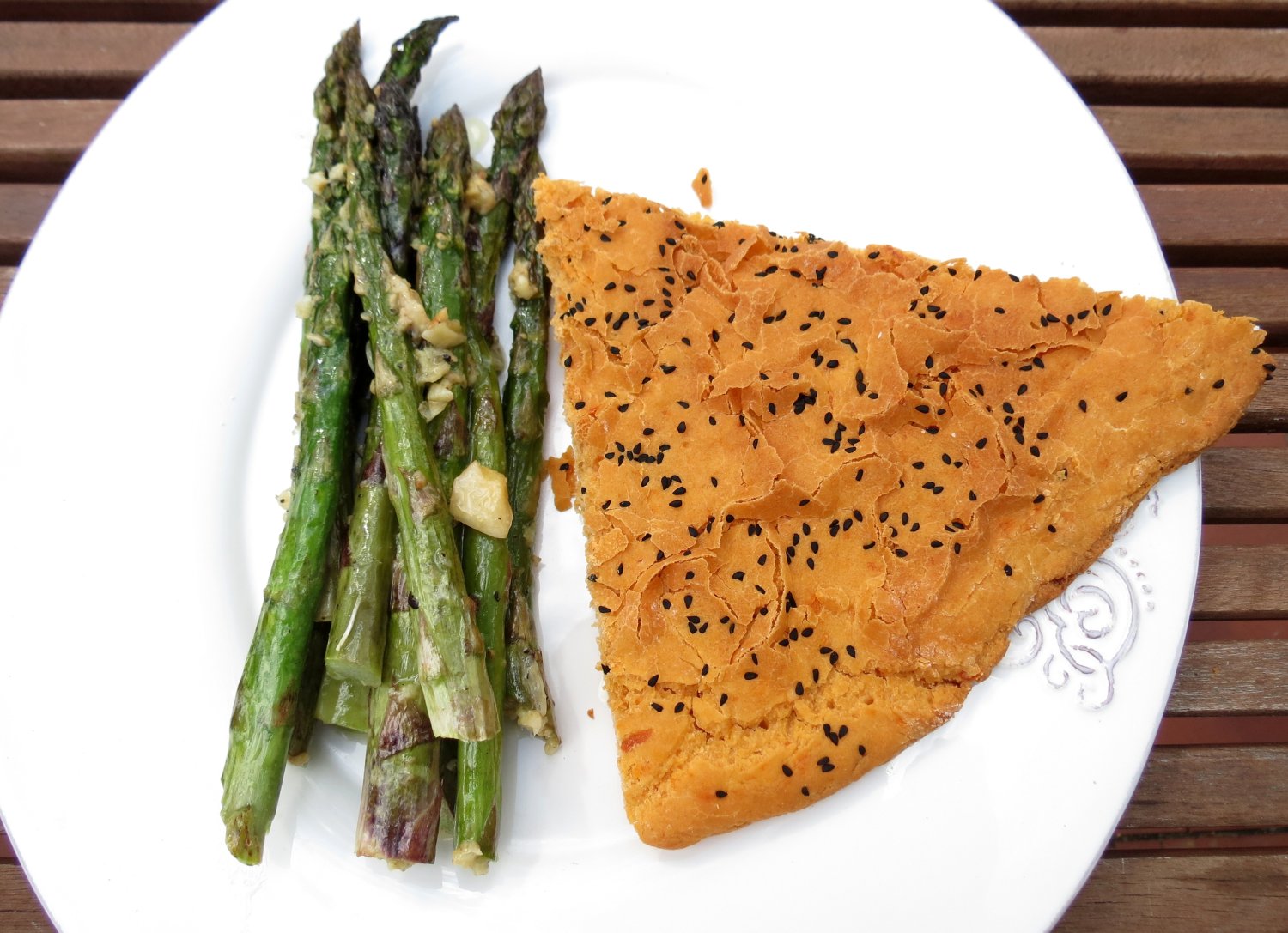 Może były trochę jeszcze rachityczne, nieregularnie powykręcane, niezbyt przekonujące swą zielonością, ale z pewnością miały ten szparagowy aromat i smak, na który czekaliśmy od zeszłorocznego sezonu. Dzisiaj więc na obiad rozkoszowaliśmy się szparagową uczta. Upiekliśmy w piekarniku nasz szczęśliwy nabytek z oliwą, solą, pieprzem i dużą ilością grubo posiekanego czosnku i zjedliśmy ze smakiem, rozpoczynając tym samym świąteczny okres obżarstwa. A ponieważ ostatnio często próbujemy robić rozmaite wypieki z mąki jaglanej, do szparagów upiekliśmy focaccię z tej właśnie mąki. Doskonale nam się sprawdziła przy wymazywaniu resztek oliwy po naszych nowalijkowych szparagach.